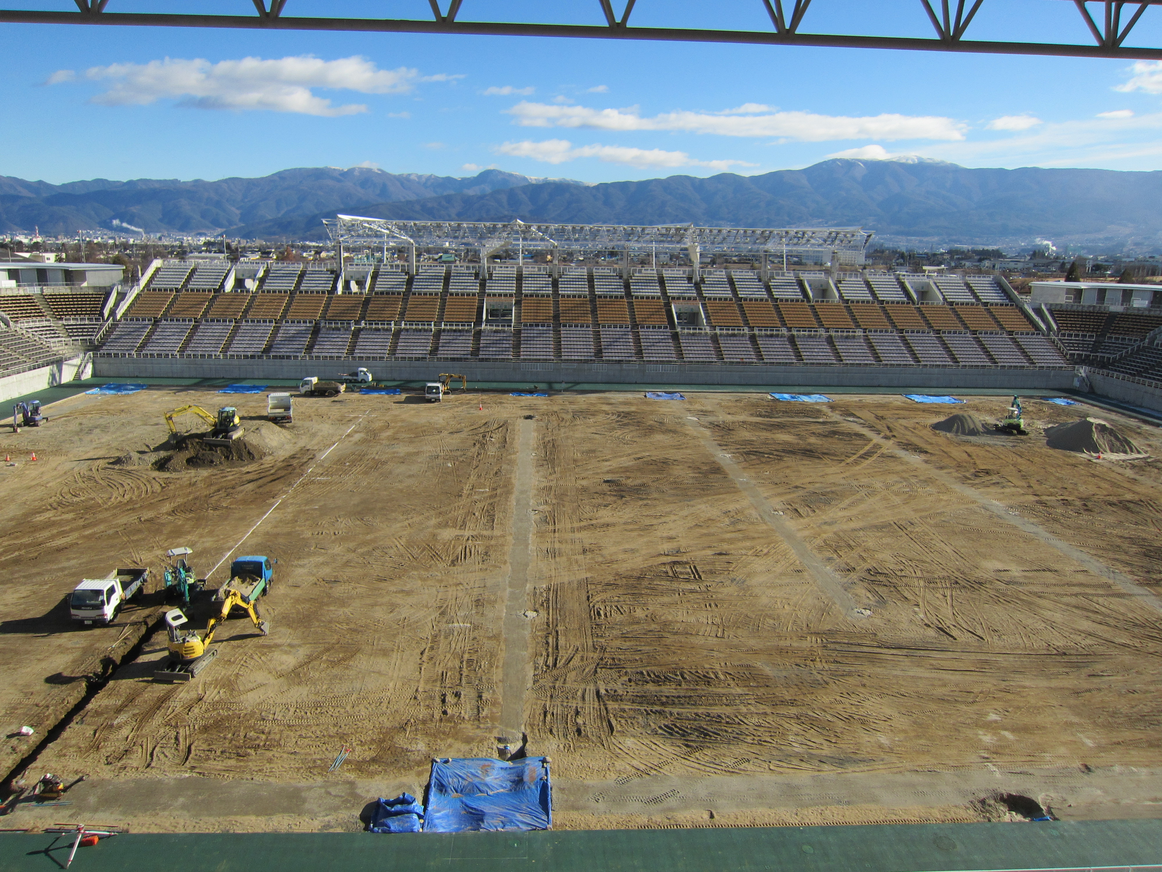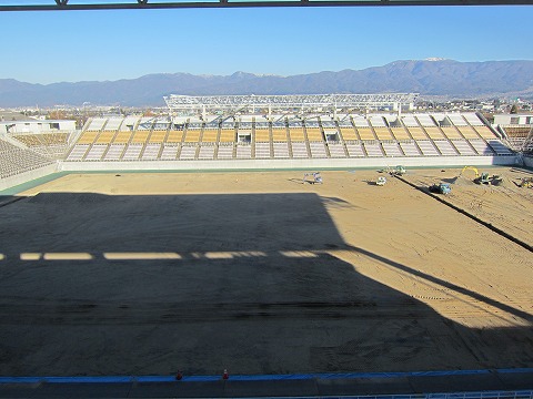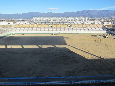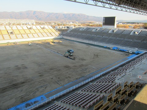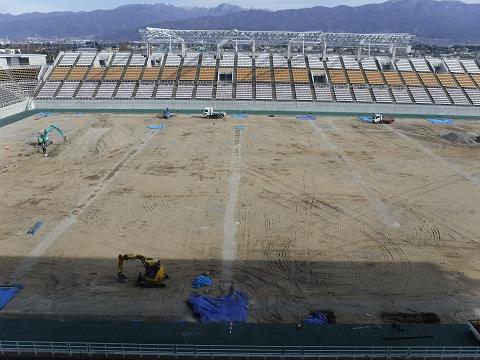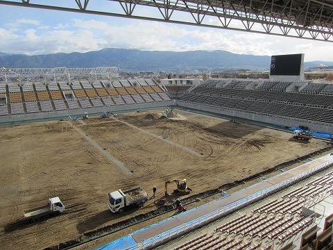 現在は音響設備と芝生の張替工事の2本立てです。